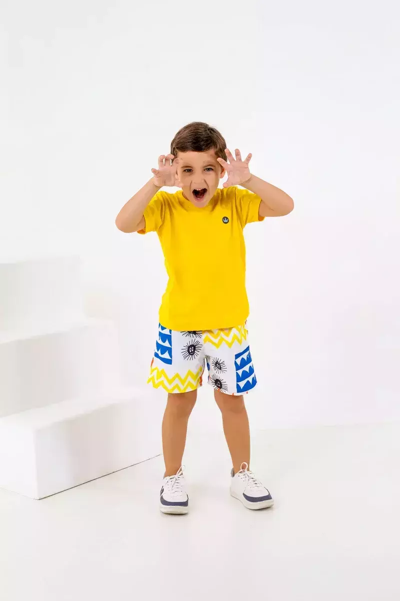- Conjunto: 01 Blusa Amarela e 01 Bermuda de Tactel branca, Sublimado estampada peixes e elementos marinhos, proporcionando muito conforto para as crianças, sem perder o estilo e a diversão.